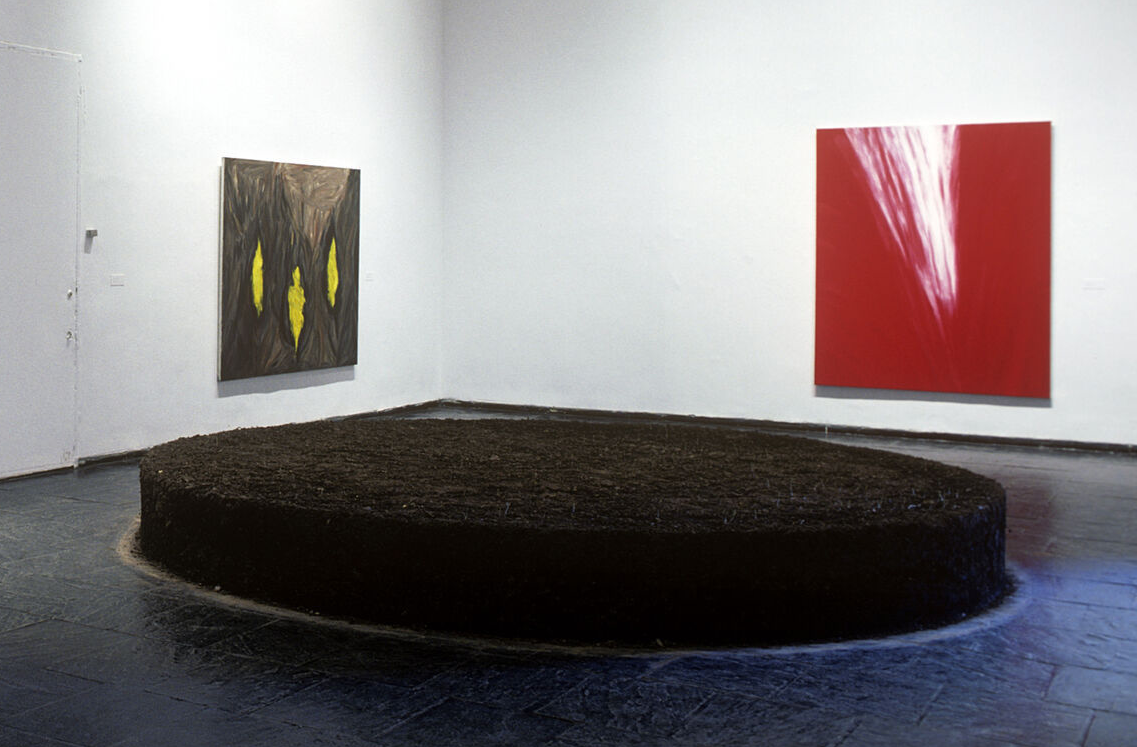 Installation view, Whitney Museum of American Art, 1989 Biennial Exhibition, April 18-July 16. On the walls: Martha Diamond, Three Lights, 1988; Red Light, 1988. Foreground: Meg Webster, Earth Stage, 1989. Photo by Geoffrey Clements, courtesy Whitney Museum of American Art