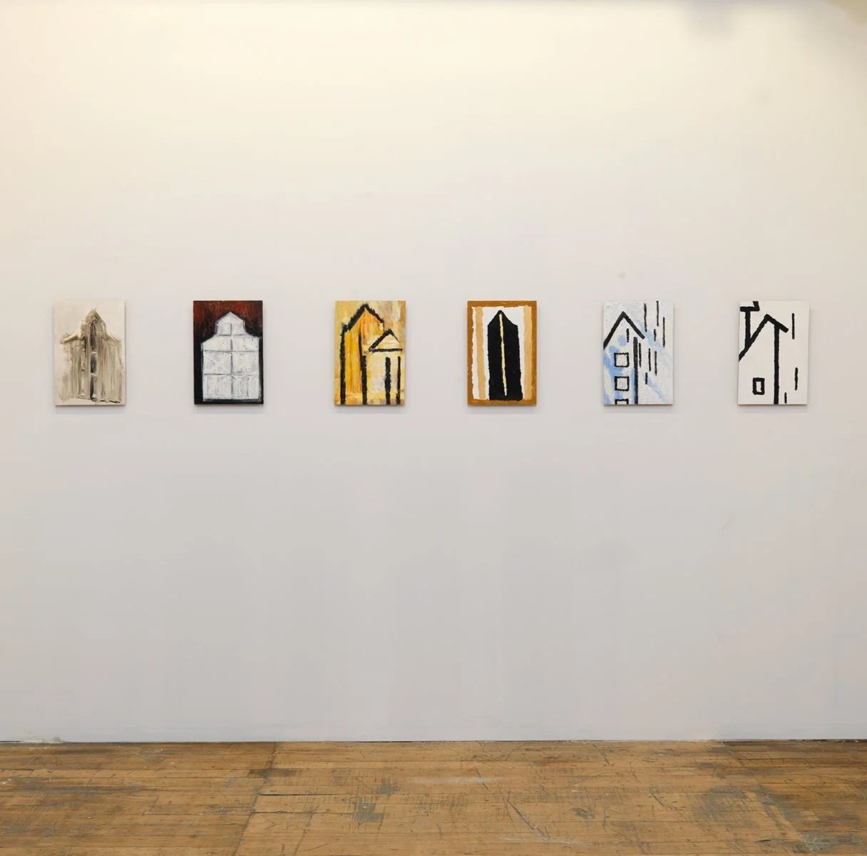 Installation views, Come Together: Surviving Sandy, Year 1, curated by Phong Bui, Industry City, Brooklyn, Oct. 20–Dec. 15, 2013. From left: Church I, Church II, Church III, Church IV, Blue, White, all 2010. Cityscape with Indian Yellow, 1994. Photos by Brian Buckley